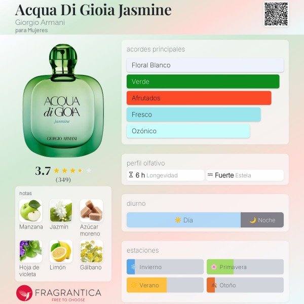 Acqua di gioia jazmine Fragancia femenina floral acuática, fresca y luminosa, con un estilo natural y delicado. Es una versión más verde y fresca dentro de la línea Acqua di Gioia.