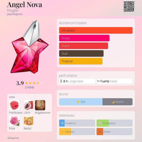 ANGEL NOVA Fragancia femenina frutal, moderna y vibrante, con un estilo dulce pero luminoso. Es más fresca y juvenil que el Angel clásico, con un toque elegante y atrevido.