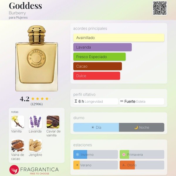 Burberry Goddess Perfume femenino dulce, cremoso y elegante, centrado en la vainilla pero con un toque aromático de lavanda que lo hace más sofisticado. Es moderno, luminoso y muy femenino, ideal para quienes buscan un dulce refinado (no empalagoso).