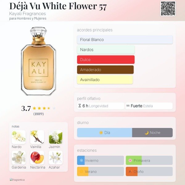 Déjà Vu White Flower | 57 Fragancia femenina (unisex) floral blanca, cremosa y sensual, con un estilo cálido y elegante. Es romántica, envolvente y muy sofisticada, típica de perfumes “lujosos y seductores”.