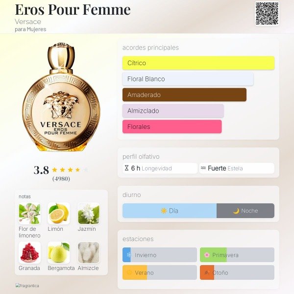 EROS Pour Femme Atracción, deseo, pasión.Es una alquimia de notas tentadoras, luminosas y femeninas. Un acorde refinado de limón y jazmín, exaltado por maderas sensuales y suaves. Vibrante y preciosa, el limón siciliano y la bergamota de Calabria llaman la atención con su resplandor. Deliciosos y acogedores granos de granada sorprenden y seducen. La infusión de jazmín y el jazmín absoluto Sambac transmiten una feminidad auténtica y atemporal. Los pétalos de peonía generosos dan un toque aterciopelado, mientras que el brillo de la flor de limón realza el acorde floral y recuerda la patria y la tradición de Versace. El ambrox es develado, profundo y misterioso. Un acorde voluptuoso hecho por maderas sensuales, sándalo cremoso y almizcle embriagador, lo combina perfectamente. Se revelan notas intensas y encantadoras que evocan sensaciones táctiles.