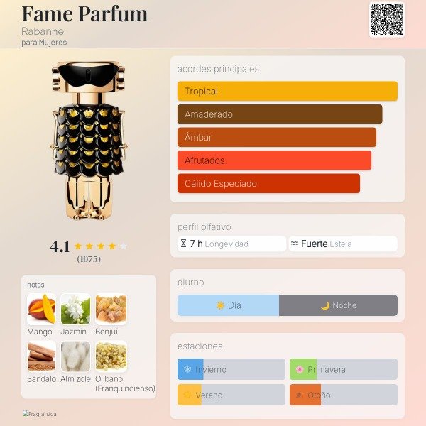 A un mango más oscuro y especiado, con flores cremosas y un fondo dulce-amaderado intenso. Se siente más “nocturno” que el Fame original, con ese toque de incienso que lo hace más elegante y diferente.