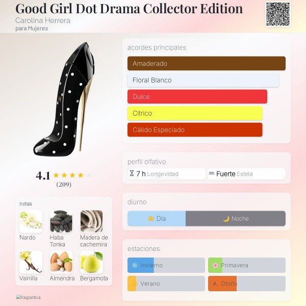 Es una versión más intensa y atrevida de la línea Good Girl. Mantiene el ADN dulce y sensual, pero con un toque más oscuro y elegante. Es un perfume llamativo, femenino y con mucha presencia.