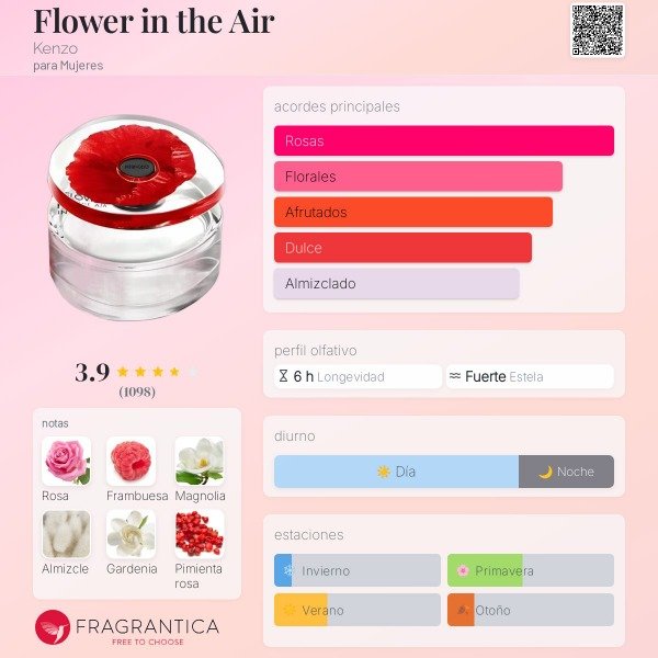 Kenzo Flower In The Air Fragancia femenina floral, fresca y luminosa, con un estilo moderno y delicado. Es una versión más ligera y juvenil dentro de la línea Flower by Kenzo.
