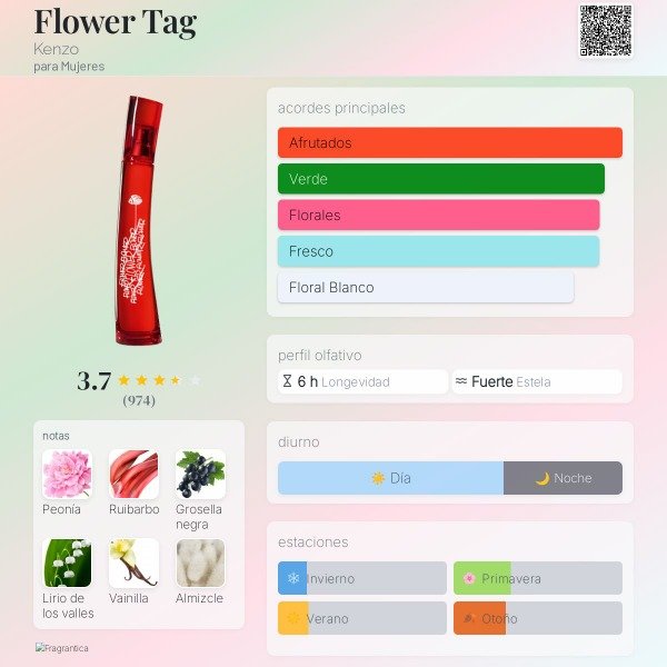 Kenzo Flower Tag Fragancia femenina floral-frutal dulce y juvenil, con un estilo moderno, urbano y divertido. Es una versión más fresca y joven de la línea Flower by Kenzo.