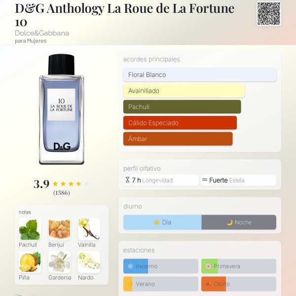 La Roue de La Fortune Fragancia femenina floral-oriental, dulce y elegante, con un estilo sensual y algo misterioso. Forma parte de la colección Anthology inspirada en cartas del tarot, representando la suerte y la audacia.