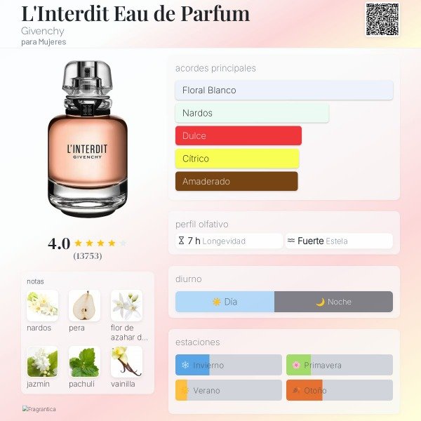 L'INTERDIT Un homenaje a la feminidad audaz. Una invitación a desafiar las convenciones y abrazarsu singularidad. Un acorde floral blanco con notas oscuras, desatandouna luminosidad audaz y elegante que coquetea con la oscuridad. Unanueva unión para sentir la atracción de lo prohibido. Notas: Unaflor blanca exaltada con un acorde oscuro. La primera flor subterránea.Las notas blancas - azahar, jazmín y nardo - se entrelazan con notas másoscuras y misteriosas de vetiver y pachulí.