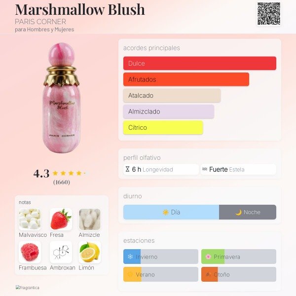 Marshmallow Blush Fragancia femenina ultra dulce, cremosa y adictiva, estilo gourmand. Es conocida por ser una alternativa accesible tipo “dupe” de perfumes como Yum Boujee Marshmallow 81, con un perfil muy goloso y llamativo.