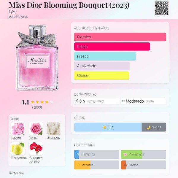 Miss Dior Blooming Bouquet es una fragancia femenina fresca, delicada y muy romántica, con un estilo floral suave tipo “ramo de flores recién cortadas”. Es elegante pero ligera, ideal para todos los días.