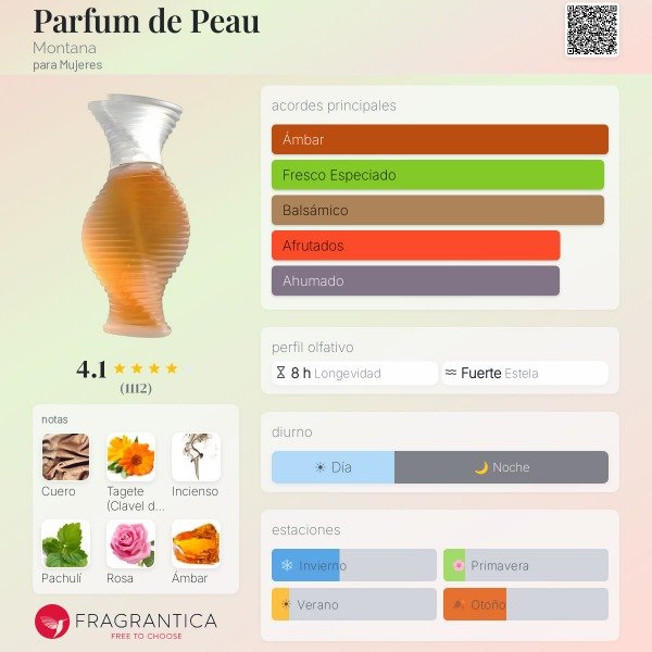 Montana Parfum De Peau Perfume femenino intenso, audaz y muy sensual, ícono de los años 80. Tiene un perfil cuero-especiado con toque floral y animal, fuerte y con mucha personalidad. Es de esos aromas que no pasan desapercibidos y marcan presencia.
