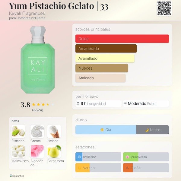 Yum Pistachio Gelato | 33 Fragancia gourmand dulce, cremosa y divertida, inspirada en un postre de pistacho. Es juvenil, llamativa y muy “rica”, aunque con un toque floral que la hace más sofisticada.