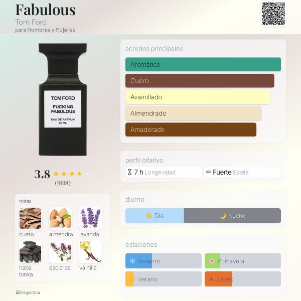 Fucking fabulous Fragancia intensa y sofisticada de Tom Ford que combina cuero, almendra amarga y vainilla cremosa. Su aroma es cálido, sensual y moderno, con un carácter audaz que destaca por su mezcla de notas dulces y cuero elegante.