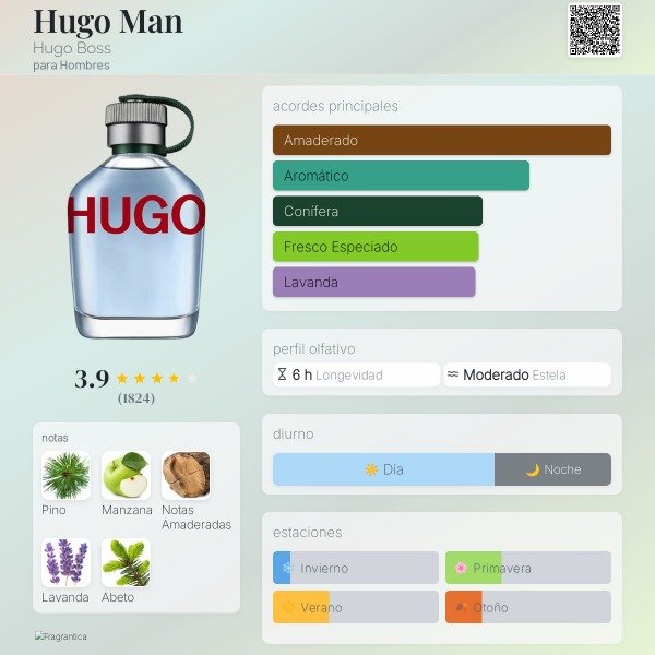 Hugo Man Fragancia masculina fresca, verde y aromática, con un estilo juvenil, libre y moderno. Es uno de los clásicos de Hugo Boss, pensado para un hombre relajado y auténtico.