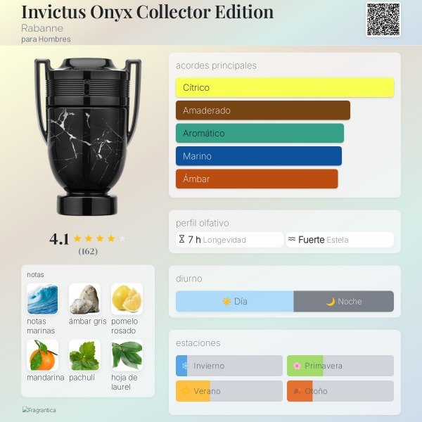 Invictus Onyx es una edición especial de la clásica línea Invictus de Paco Rabanne con frescura acuática y un toque más profundo y potente. La botella es negra y metálica, inspirada en la piedra de ónix, simbolizando fuerza, victoria y energía.