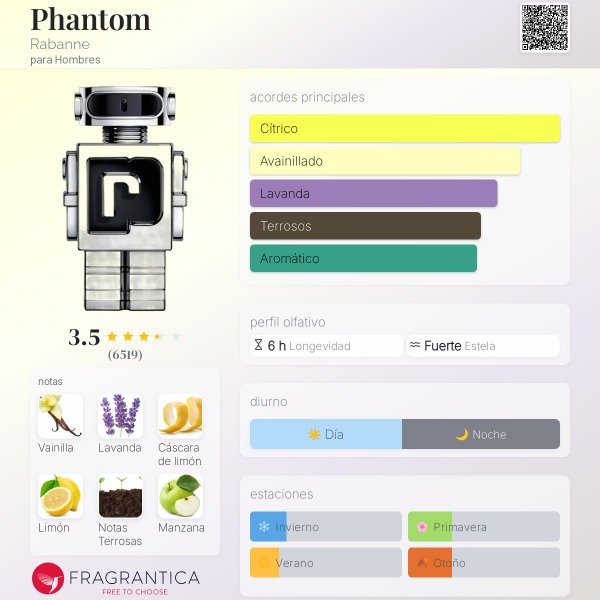 PHANTOM, la nueva fragancia para hombre de Paco Rabanne. La esencia de la confianza en uno mismo, alimentada por la energía del sentirse bien. Una aromática fragancia futurista nacida del encuentro entre la artesanía de lujo y la tecnología. Formulada mediante un proceso creativo vanguardista para seleccionar los ingredientes que te hagan sentir energizado, poderosamente seguro y sexy. Una fragancia audaz con notas de lavanda cremosa y adictiva, limón energizante y vainilla amaderada.