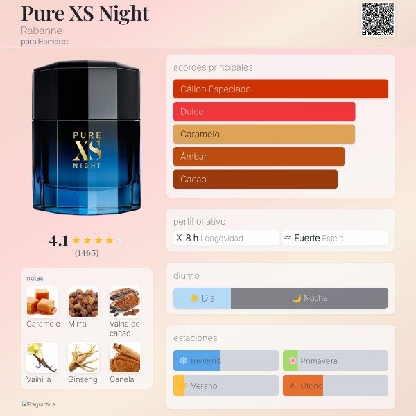 Pure XS Night Fragancia masculina intensa, dulce y especiada, con un perfil nocturno muy seductor. Es más oscura y potente que Pure XS, pensada para destacar y llamar la atención.