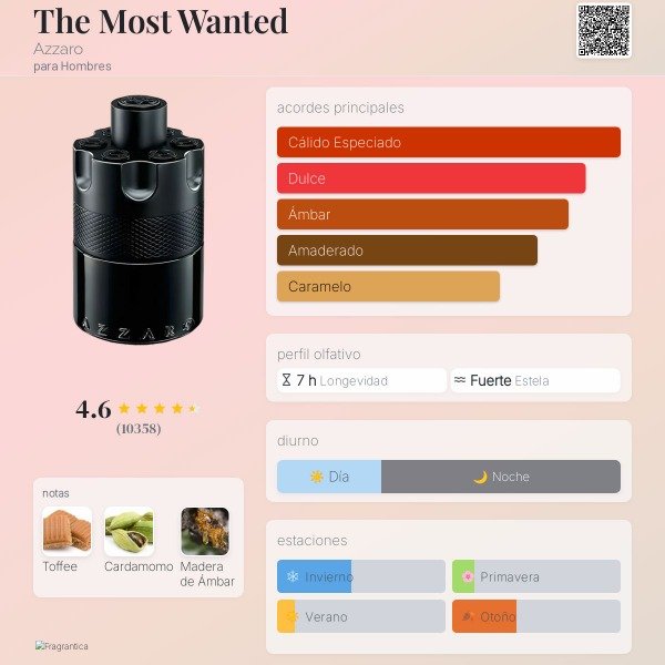 The Most Wanted de Azzaro es una fragancia de la familia olfativa Oriental Especiada para Hombres. The Most Wanted fue creada por Michel Girard, Nadège Le Garlantezec y Shyamala Maisondieu. La Nota de Salida es cardamomo; la Nota de Corazón es tófe; la Nota de Fondo es Amberwood.