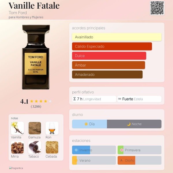 Tom Ford Vanille Fatale Fragancia unisex de alta gama, profunda y seductora, donde la vainilla se presenta en su versión más oscura, especiada y sofisticada. No es una vainilla dulce típica: es intensa, misteriosa y con carácter.