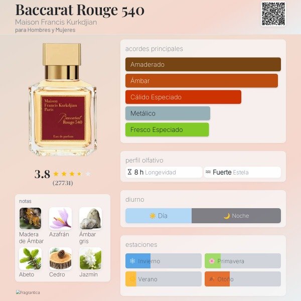 Bacarat Rouge 540 Fragancia unisex lujosa, dulce y envolvente que mezcla lo floral con lo ambarado y amaderado. Es un aroma intenso, elegante y muy distintivo, conocido por dejar una estela adictiva y sofisticada.