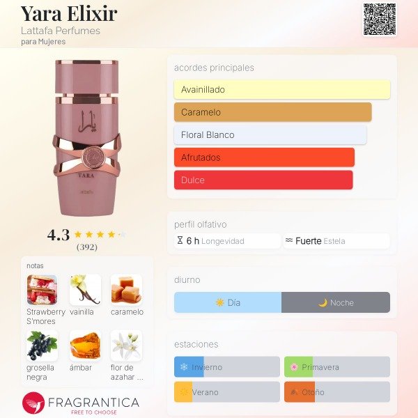Yara Elixir es un perfume femenino dulce, cremoso y envolvente, con un perfil gourmand elegante. Combina notas avainilladas y florales suaves sobre un fondo cálido y sensual, ideal para quienes buscan una fragancia femenina, adictiva y moderna, perfecta para el uso diario o salidas nocturnas. ✨💗