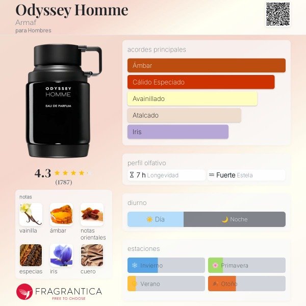 Armaf Odyssey Homme es una fragancia masculina cálida, oriental-amaderada y sofisticada, pensada para quienes buscan un perfume con carácter y presencia sin ser demasiado abrumador. Está diseñada para el hombre moderno que quiere un aroma elegante y versátil, ideal sobre todo para otoño/invierno, salidas nocturnas o momentos especiales.