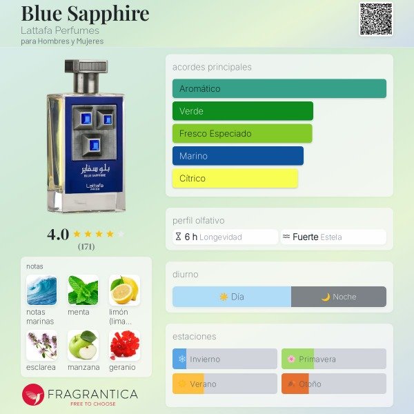 Blue Shappire Lattafa Es una fragancia unisex diseñada tanto para hombres como para mujeres. Su aroma es principalmente aromático y verde, con toques frescos de especias, notas marinas y cítricos.