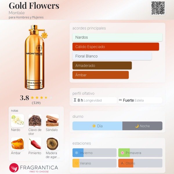 Gold Flowers Fragancia unisex floral blanca, especiada y elegante, con un estilo oriental moderno. Es intensa, sofisticada y con un toque exótico típico de Montale.