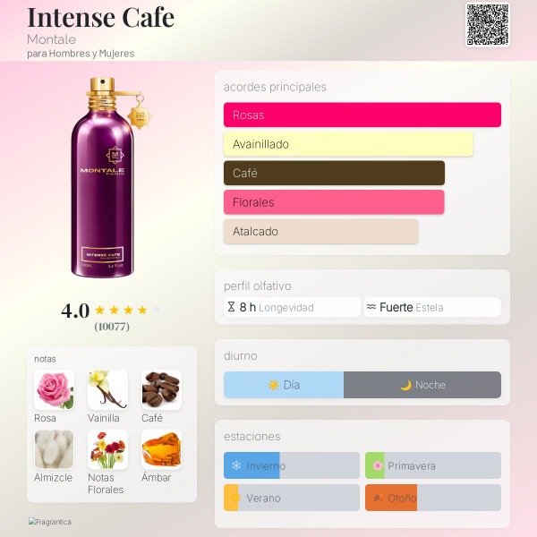 Intense Café Fragancia unisex dulce, elegante y adictiva, con un estilo gourmand-floral muy sofisticado. Es uno de los perfumes nicho más conocidos de Montale, famoso por su combinación de rosa + café + vainilla.