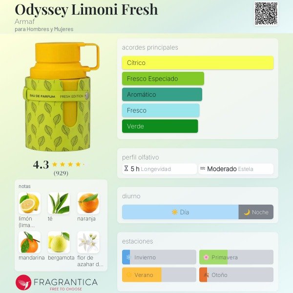 Fragancia fresca, cítrica y energizante. Destacan notas luminosas de limón y mandarina, combinadas con un toque suave floral y amaderado, creando un aroma juvenil, vibrante y perfecto para el día a día o climas cálidos. 🍋✨