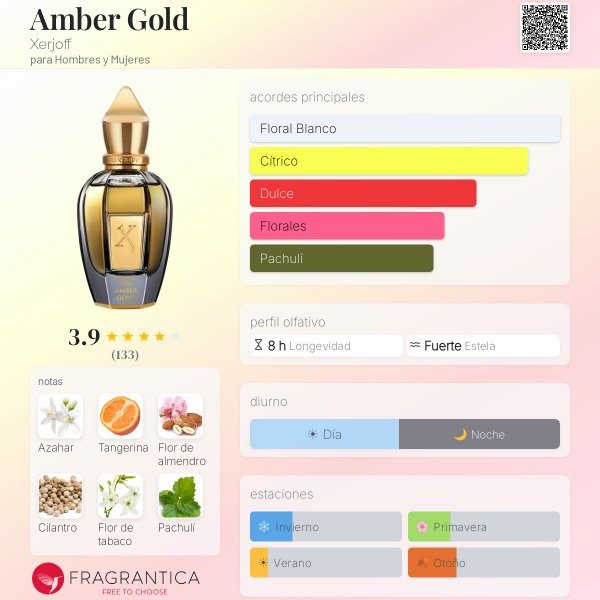 Amber Gold de Xerjoff es una fragancia de la familia olfativa Oriental Floral para Hombres y Mujeres. Amber Gold se lanzó en 2018. Las Notas de Salida son naranja tangerina y cilantro; las Notas de Corazón son flor de azahar del naranjo, flor del almendro y flor del tabaco; las Notas de Fondo son pachulí y almizcle.
